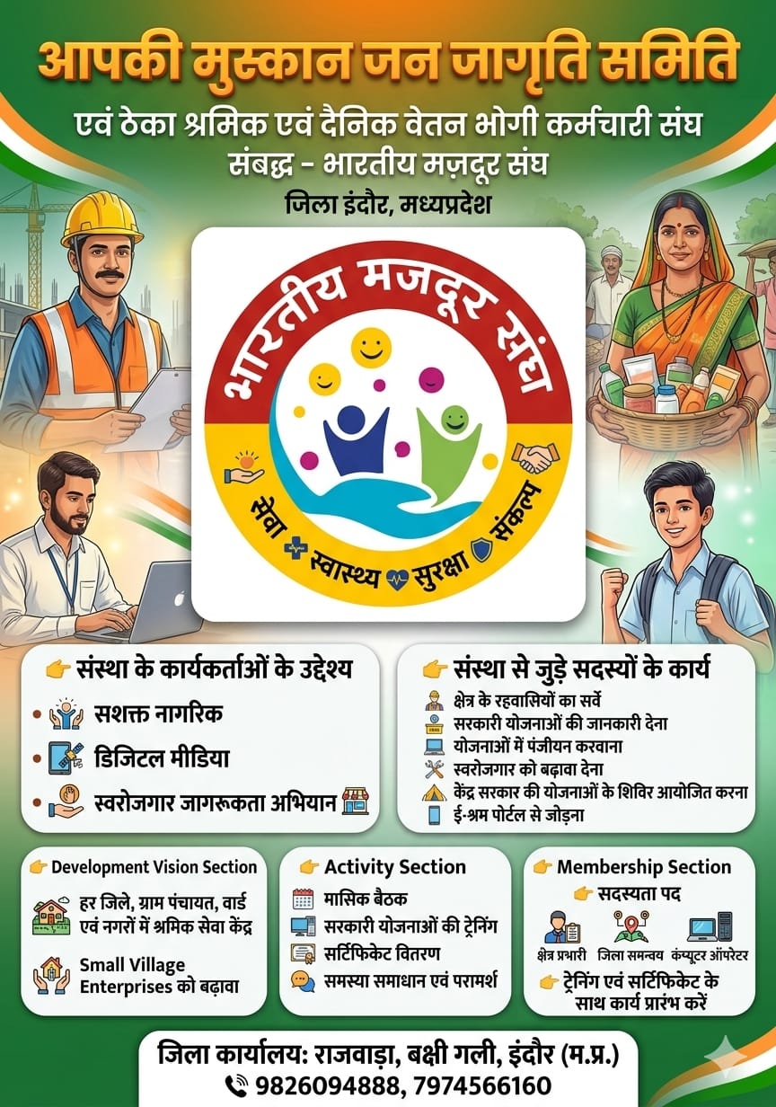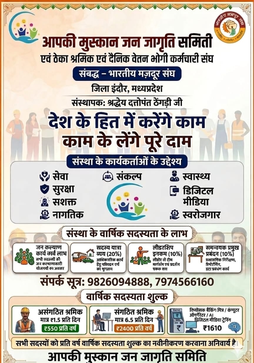 भारतीय मज़दूर संघ सदस्यता अभियान देश के हित में करेंगे काम काम के लेंगे पूरे दाम संस्था के कार्यकर्ताओं उद्देश्य सेवा - संकल्प - स्वास्थ - सुरक्षा - स्वरोजगार
